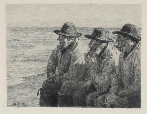 Michael Ancher: "Tre fiskere". Opus 1. Tryksign. M. A. 98. Radering. Lysmål 25 x 31,5 cm.