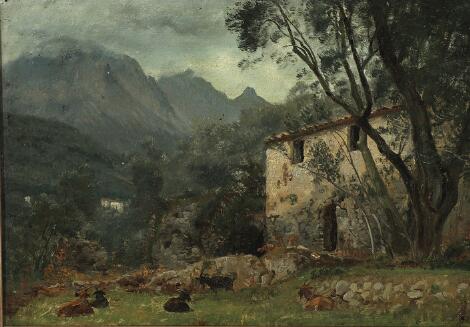 Christian Zacho: Fransk bjerglandskab med en gammel vandmølle. Sign. C. Z. 1880 samt utydelig stedbetegnelse (under rammekant). Olie på mahogni. 23,5 x 32,5 cm.