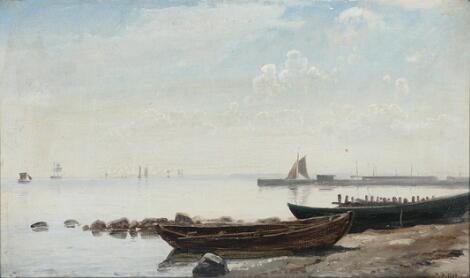 Christian Blache: Optrukne joller på en strand. Sign. Chr. B. 1871. Olie på lærred. 18,5 x 27 cm.