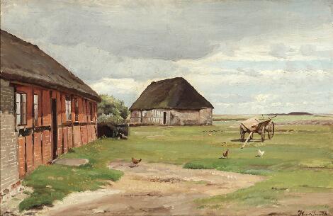 Hans Smidth: En kærre på en gårdsplads i et åbent landskab. Sign. Hans Smidth. Olie på lærred monteret på lærred. Ca. 38 x 58 cm.