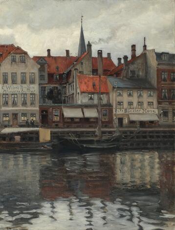 Peter Tom-Petersen: Gamle huse ved Helsingør Havn. Sign. Tom Petersen. Olie på lærred. 63 x 49 cm.
