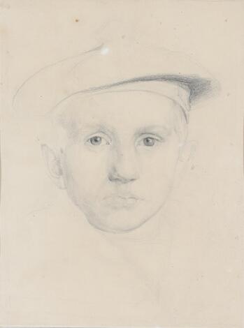Ubekendt maler, 19. årh.: Portræt af en ung mand med hat. Usigneret. Bly på papir. Lysmål 36 x 27 cm.