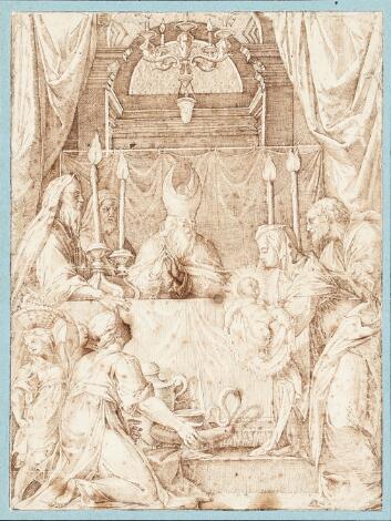 Federico Zuccaro, efter, 17. årh.: Præsentationen af Kristus i templet. Usigneret. Pen på papir. Bladstørrelse 270×200 mm.