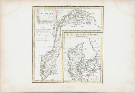 Didier Robert de Vaugondy: "Norwege" og "Royaume de Danemarck". 1795. Håndkoloreret kobberstik. 29,5 x 42,5 cm. Uindrammet.