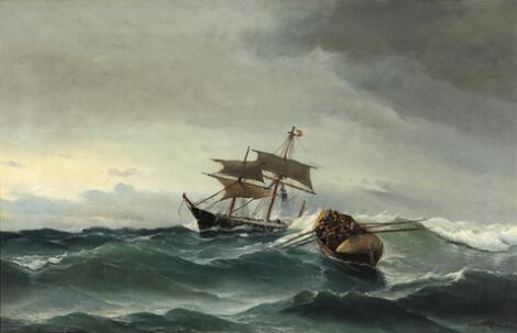 Vilhelm Bille: Redningsbåden går ud til et nødstedt skib. Sign. Vilh. Bille. Olie på lærred. 60 x 93 cm.