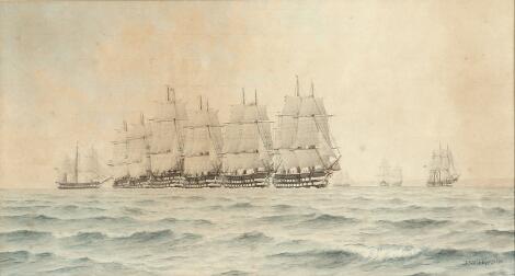 Viggo Adolf Valdemar Hoff: Svenske krigsskibe på havet. Sign. Viggo A. V. Hoff 1901. Vandfarve og gouache på papir. Lysmål 34 x 64 cm.