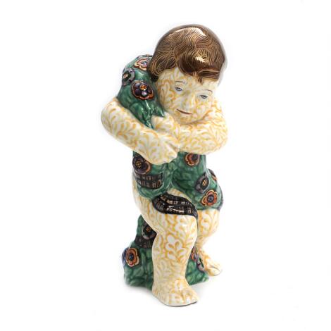 Rasmus Harboe: Englebarn med blomsterranke. Figur af fajance dekoreret i farver og guld. 989/817. Aluminia. H. 25 cm.