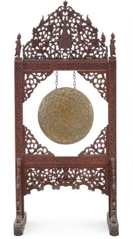Thailandsk gong på stativ af hardwood. 20. årh.s første havdel. H. 162 cm B. 72 cm D. 52 cm.