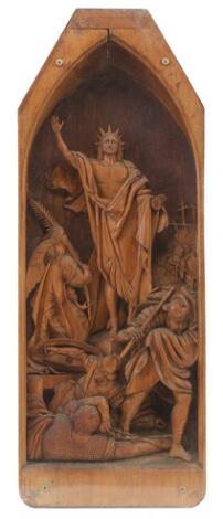 Kristi opstandelse, relief af udskåret træ, 19. årh. I senere spidsbuet kasse med front af plexiglas.H. 103 cm B. 38 cm D. 13 cm.