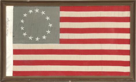 13 stjernet amerikansk flag af silke, kopi efter Betsy Ross signeret af Rachel Wilson Albright. Ca. 1900. Indrammet. 27 x 47 cm.
