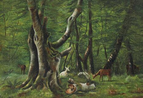 Dansk maler, 19. årh.: Parti fra en skov med rådyr. Usigneret. Olie på lærred. 23 x 32.