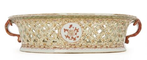 Ostindisk famille rose jardiniere, gennembrudte sider. Qianlong 1736-1795. H. 9 cm L. 34 cm B. 28 cm.