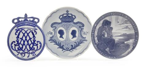 To platter og en mindeplakette af porcelæn, dekorerede i blåt. Royal Copenhagen. (3)