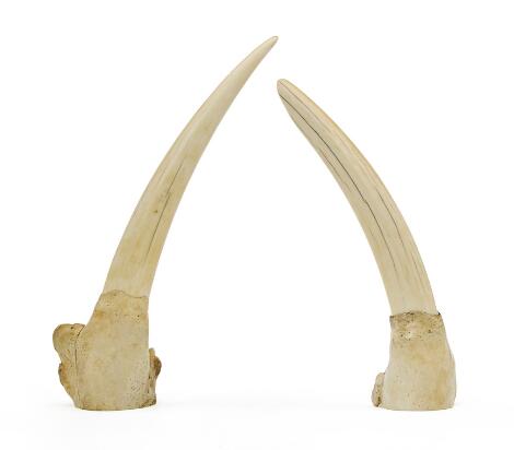 To hvalrostænder (Odobenus Rosmarus), hver med dele af overkæbe og fire tænder. 1960erne. L. 34 og 39 cm. (2)