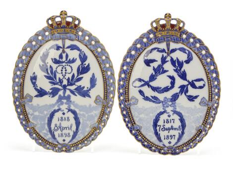 To mindeplaketter af porcelæn, Dronning Louise og Kong Christian IX. Royal Copenhagen. 23 x 17,5 cm. (2)