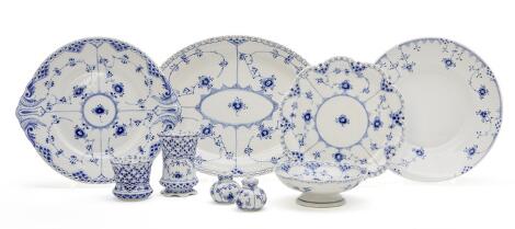 "Musselmalet, Halv- og Helblonde" servicedele af porcelæn, dekorerede i underglasur blå, samt en "Elements" skål. Royal Copenhagen. (9)