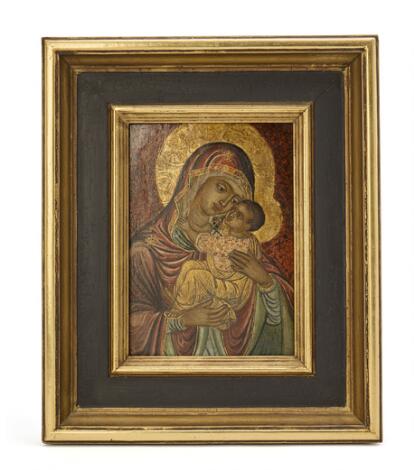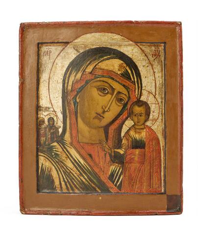 Russisk ikon med fremstilling af Gudsmoderen Kazanskaja. Tempera på træpanel. 19. årh. 30 x 26 cm.