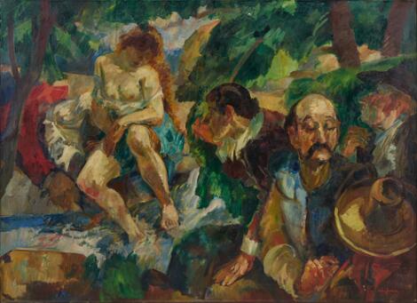 Ludvig Jacobsen: "Don Quixote møder den smukke Hyrdinde". Sign. Ludvig Jacobsen. Olie på lærred. 104 x 145 cm.