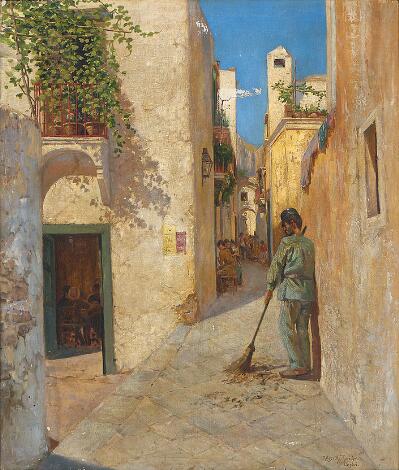 Holger H. Jerichau: Solrigt gadeparti fra Capri. Sign. Holger H. jerichau Capri. Olie på lærred. 78,5 x 67 cm.