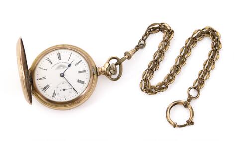 Dobbeltkapslet lommeur af 14 kt. guld. Ankergang og kroneoptræk. Ø 49 mm. Samt urkæde af 14 kt. guld. Ca. 1920.
