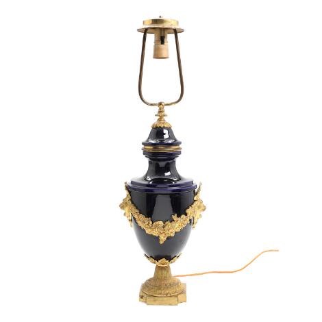 Fransk bordlampe af porcelæn med “bleu de roi”-glasur. 19. årh.s slutning. H. inkl. montering 71.