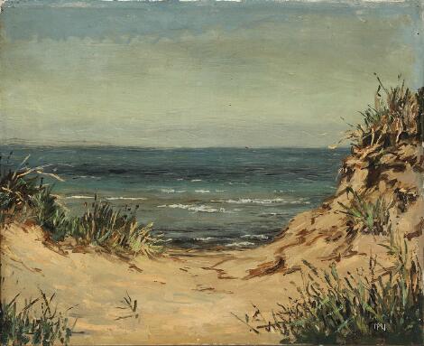 2547/198LyngbyMarinus Nielsen: Strandparti med udsigt til vandet, antageligt fra Læsø. Sign. monogram. Olie på lærred. 30,5 x 37 cm.