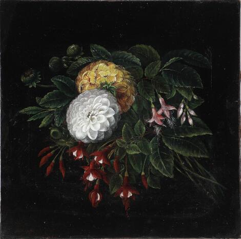 2547/197LyngbyUbekendt maler, 19. årh.: Buket med georgine og fuchsia. Usigneret. Olie på lærred. 30,5 x 30,5 cm. Uindrammet.