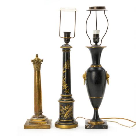 2547/243LyngbyTre diverse bordlamper af henholdsvis bronze, bemalet metal og bemalet træ. 19-20. årh. (5)