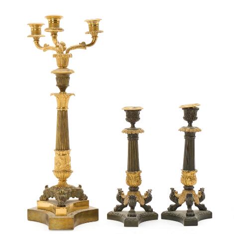 2547/218LyngbyEt par franske Charles X form stager af patineret og forgyldt bronze samt en kandelaber med tre lysarme, 19. årh. (3)