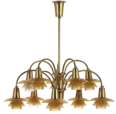 2547/661LyngbyPoul Henningsen: "PH-1/1 Bombardement". Ti-armet lysekrone med stel og koniske fatningshuse af messing med skærme af ravfarvet glas.