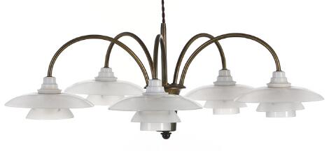 2547/651LyngbyPoul Henningsen: "Bombardement". Femarmet lysekrone af messing. Skærme af matglas. Udført hos Louis Poulsen.