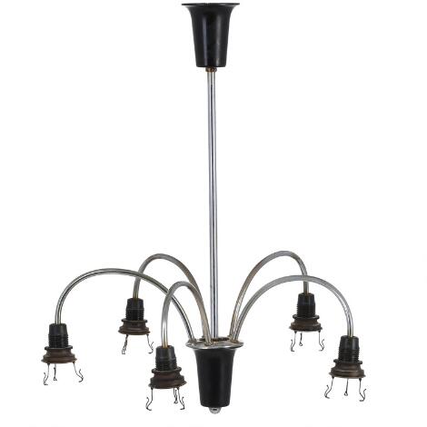 2547/653LyngbyPoul Henningsen: "PH-1/1". Stel til fem-armet bombardementkrone af forniklet metal, fatningshuse og baldakin af bakelit.