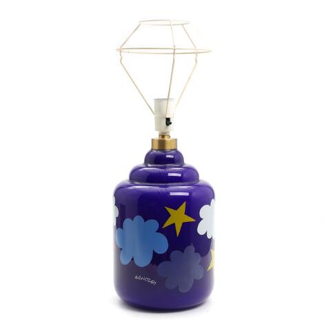 2547/731AarhusPer Arnoldi: Arnoldi”. Bordlampe af blåt glas med påtrykte polykrome motiver i form af skyer og stjerner. Stemplet. H. 30,5.