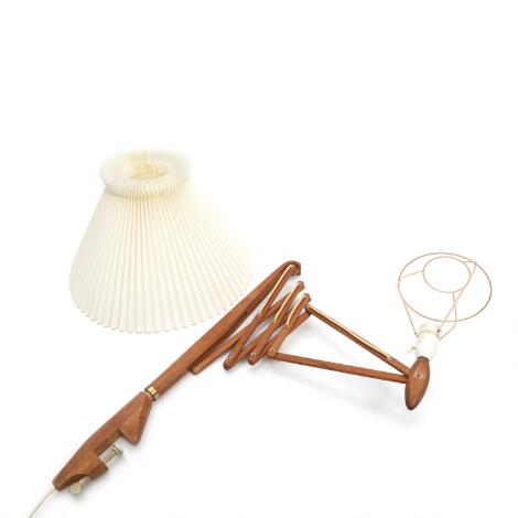 2547/697AarhusErik Hansen: Sakselampe til bordmontering med stel af eg. Udført hos Le Klint. H. 66. L. 37-90.