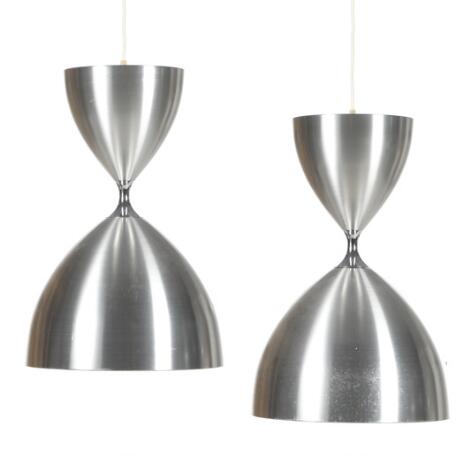 2547/701AarhusJo Hammerborg: “Vega”. Et par timeglasformede pendler af børstet aluminium. Fog & Mørup. H. 55. Diam. 38 cm. (2)