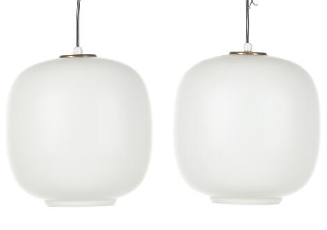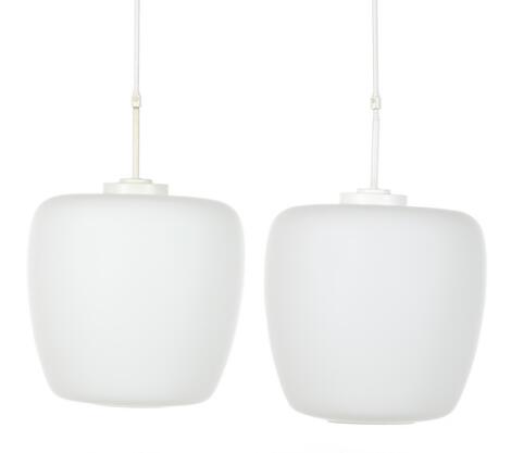 2547/703AarhusVilhelm Lauritzen: "Radiohus". Et par pendler med skærme af opalglas. Udført hos Louis Poulsen. 1950-60'erne. H. 25. Diam. 25. (2)