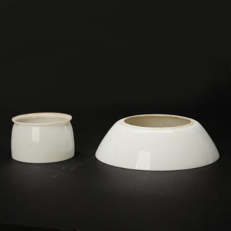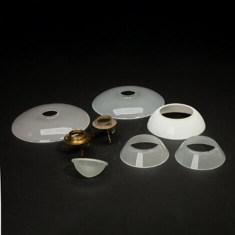 2547/699LyngbyPoul Henningsen: "PH-3/2" og "PH-2/2". Reservedele. To fatningshuse af bakelit samt tre matglasskærme. (5)