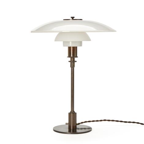2547/834LyngbyPoul Henningsen: "PH-3/2". Bordlampe med stel af patineret messing mærket Pat. Appl. Skærme af enkeltlags opalglas. Udført hos Louis Poulsen.