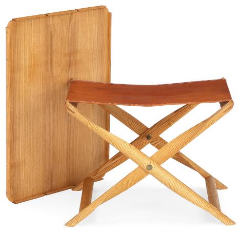 2547/594LyngbyKaare Klint: “The Propeller Stool”. Ash wood folding stool with matching tray top. Seat with brown leather.