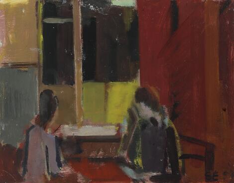 2547/572AarhusSvend Engelund: Interior with two figures at a table. Signed SE. Oil on compoboard. 28 x 35 cm.