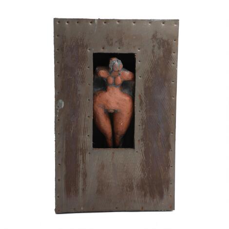 2547/605AarhusNiels Helledie: "Horekassen". Unsigned. Stoneware in a partly metal lined wooden box. H. 55. W. 35 cm.