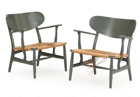 2547/593AarhusHans J. Wegner: "CH 22". A pair of easy chairs with grey lacquered oak frame and moulded back, seat with papercord. Manufactured by Carl Hansen & Søn. (2)