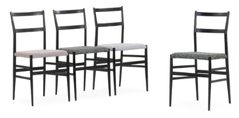 2547/597LyngbyGio Ponti: "Superleggera". Set of four black lacquered wood chairs. Upholstered with different patterned fabric. (4)