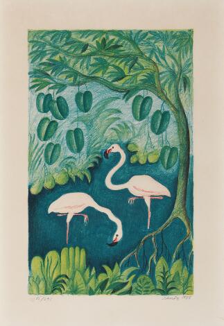 2547/647AarhusHans Scherfig: “Flamingoer”. Signeret Scherfig 1978. Litografi i farver. Lysmål 51,5 x 35,5 cm.