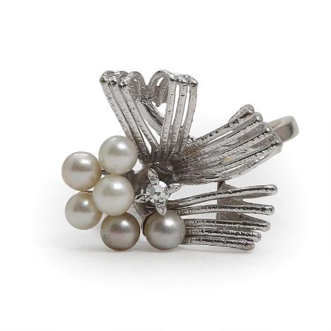 Perle-og diamantring af 14 kt. hvidguld prydet med perler og diamant. Str. 56.
