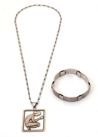 Bernhard Hertz: Smykkesæt af sterlingsølv bestående af armbånd og halskæde med vedhæng. L. 18,4-60 cm. (2)