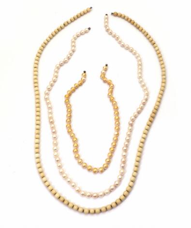 Ole Lynggaard: Tre halskæder henholdsvis prydet med kulturperler, plastik perler og hvide perler, samt dupper af sølv. (3)
