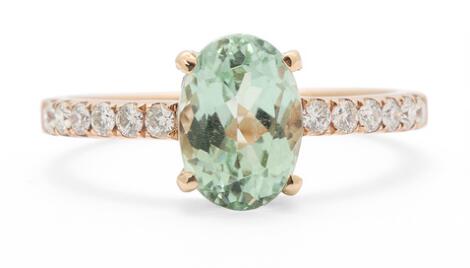 Turmalin- og diamantring af 18 kt. rosaguld prydet med ovalslebet turmalin samt brillantslebne diamanter. Str. 51,5.