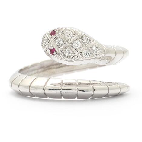 Diamant- og rubinring af 18 kt. hvidguld i form af slange prydet med diamanter og rubiner. Str. 55.