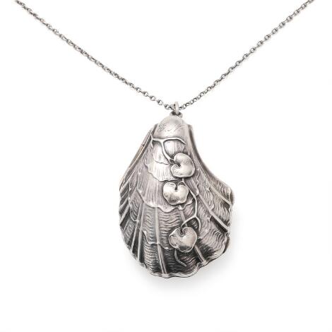 Oplukkeligt vedhæng af delvis forgyldt sølv i form af musling. Kæde af sterlingsølv medfølger. Kæde L. 80 cm. (2)